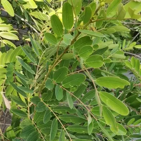 叶长4-8厘米;叶柄上无腺体;叶轴上每对小叶间有棒状的腺体1枚;小叶3对,膜质,倒卵形或倒卵状长椭圆形,长2-6厘米,宽1.5-2.5厘米,顶端圆钝而有小尖头,基部渐狭,偏斜,上面被稀疏柔毛,下面被柔毛;小叶柄长1.5-2毫米;托叶线状,被柔毛,早落。