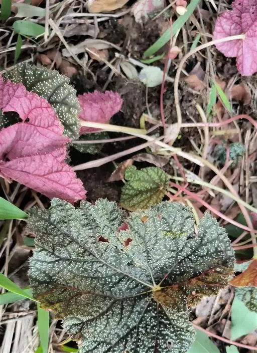 紫背天葵(学名:Begonia fimbristipula Hance):多年生小草本,高4-12厘米。块茎肉质,球形,无茎。基生叶通常1片;柄纤细,长2-6厘米,有长粗毛;叶片卵状心形,长2.5-7厘米,宽2-6厘米,先端渐尖,基部心形,近对称,边缘有不规则的尖锯齿,基出7-9条脉,两面有伏生粗毛,下面紫色。夏季开粉红色花,花单性同株,2-4朵花组成聚伞状花序,总花梗纤细,长超过叶片;雄花被片4,雄蕊多数;雌花被片3,子房下位,花柱3。蒴果三角形,有3翅,1翅特大,其他2翅条形。