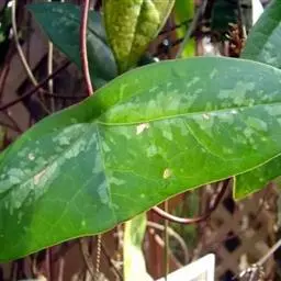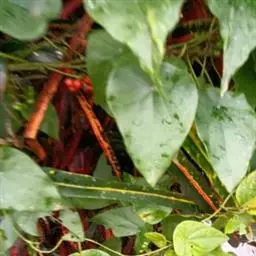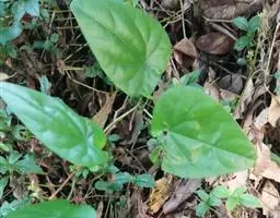 2、云南地不容:又名一滴血、红藤。多年生草质藤本,长2-3.5m。块根大。茎枝稍粗,枝、叶折断有紫红色汁液渗出。叶互生;叶柄与叶片近等长或较长;叶片三角状圆形或三角状扁圆形,长3.5-11.5cm,宽4-12.5cm,先端短尖或钝,基部近平截或微凹;掌状脉9-10条,网状脉稍明显,薄纸质。花小,单性,雌雄异株;雄株为复伞形聚伞序,总花序梗长3-6.5cm,纤细,伞梗8-10余个,长1-2cm,甚细;雄花:萼片6,具紫色斑纹,排成2轮,外轮倒披针形或倒卵形,长1.2-1.6mm,宽0.4-0.5mm,内轮有爪,上部瓣片近菱形,长2-2.2mm,宽达1.4mm;花瓣3,橙色具紫色条纹,阔楔形,长0.8-1.3mm,宽1.5-1.8mm,稍肉质,内面近中部有2个大腺体;雄蕊柱长0.8-1mm。雌株果序为复伞形,总果序梗长4-7cm,序梗稍纤细,伞梗多达10余个,长短不齐,长1-3cm。核果宽倒卵形,内果皮长5-6.5mm,背部有4行短柱状雕纹,先端膨大呈头状,每行15-17颗,胎座迹近正中穿孔。花期5-6月,果期6-9月。