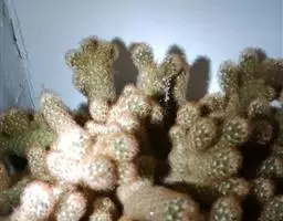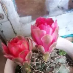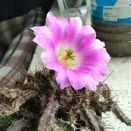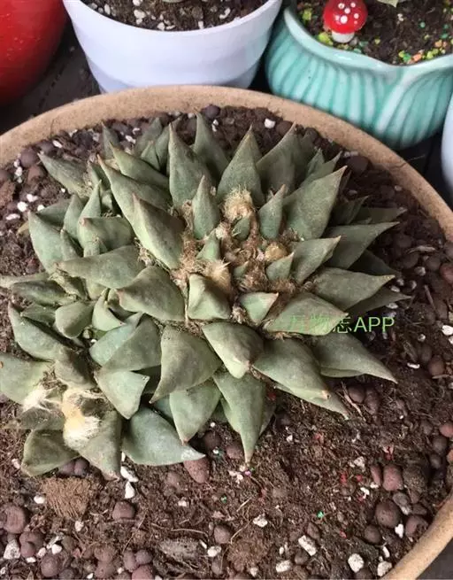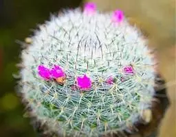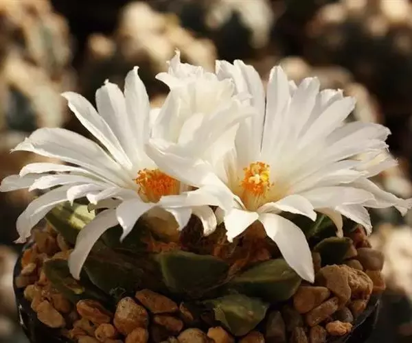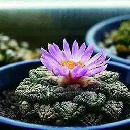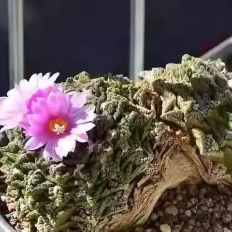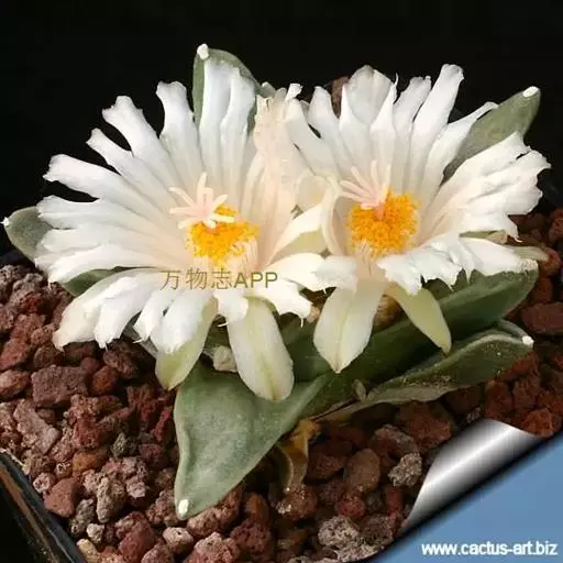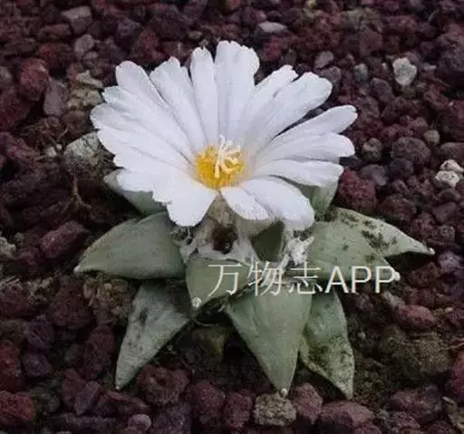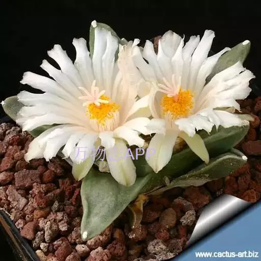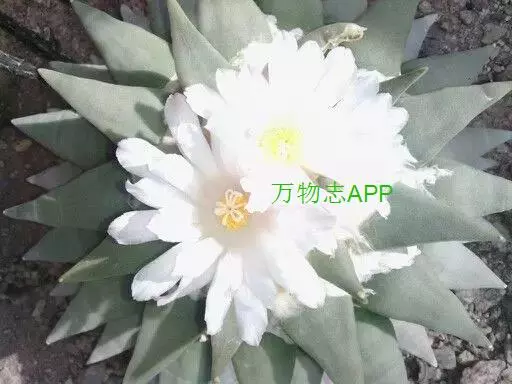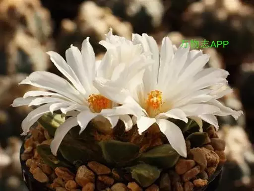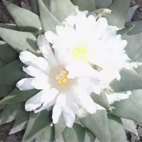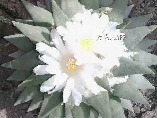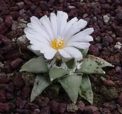 岩牡丹(Ariocarpus retusus) 原产地:墨西哥北部,是生长在亚热带的肉质仙人掌,岩牡丹半埋藏于土中,有着很大的主根。上部份扁平,直径为6-12厘米,有三角形的结节,重叠形成横向的皱纹。岩牡丹完全没有冠,及呈灰色,在其生长地很易收藏自己。岩牡丹顶有毛,生长几年后会长出粉红色或黄色的大花朵。岩牡丹含有苦味及有毒的生物碱,如大麦芽碱。这些生物碱可以保护植物本身免于草食性的动物所吃。