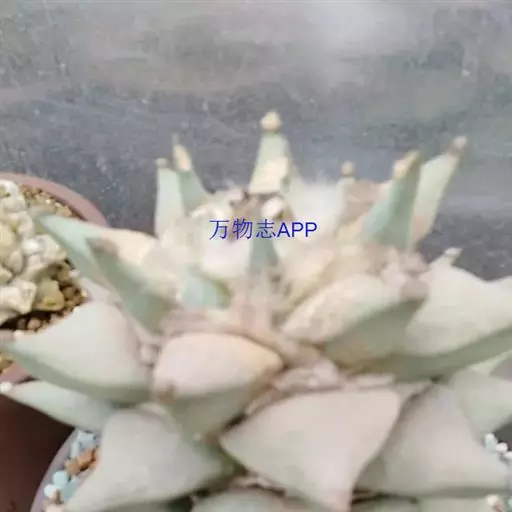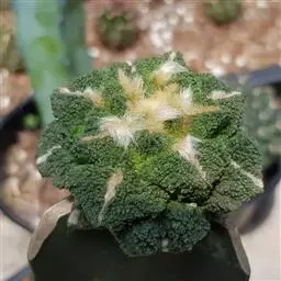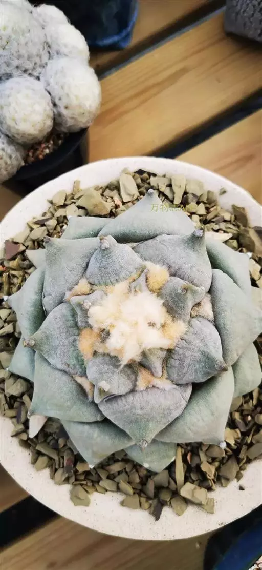 无刺的仙人掌类植物,具肥厚的直根。植株呈球形或扁球形,灰绿色,被白粉。有许多疣状突起,疣状突起呈莲座状,绿色或灰绿色,表面被白粉,上扁平或微凹,平滑;外观上看没有刺,事实上植株中部刚长出的疣突是有刺的,但很小而且早衰,所以看上去没有。疣突间有白色或淡黄色绵毛 。夏季开花,花生于茎中心处,花被片白色;浆果光滑,以后变干,种子黑色 。
