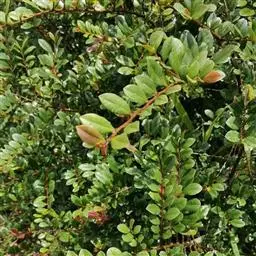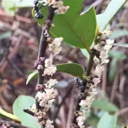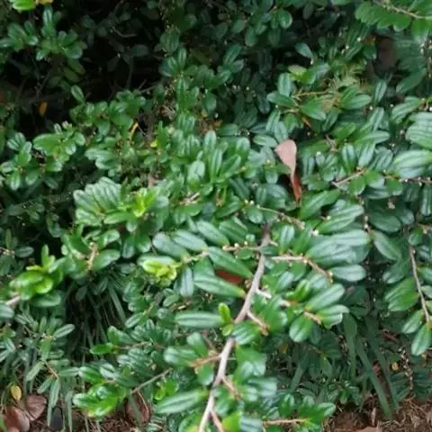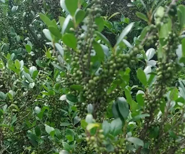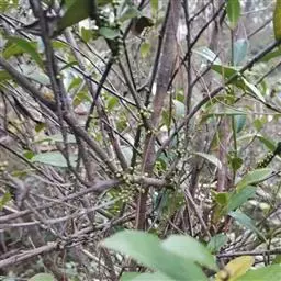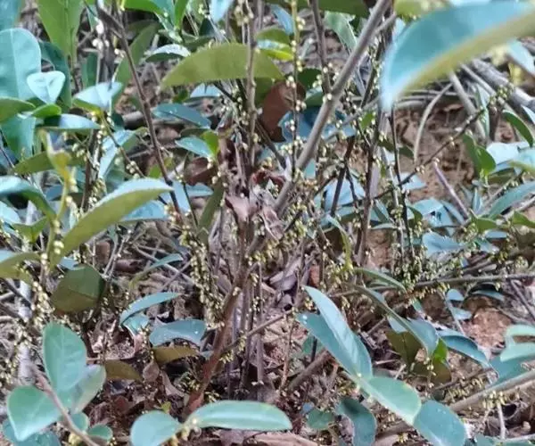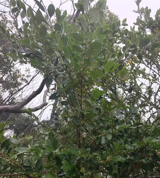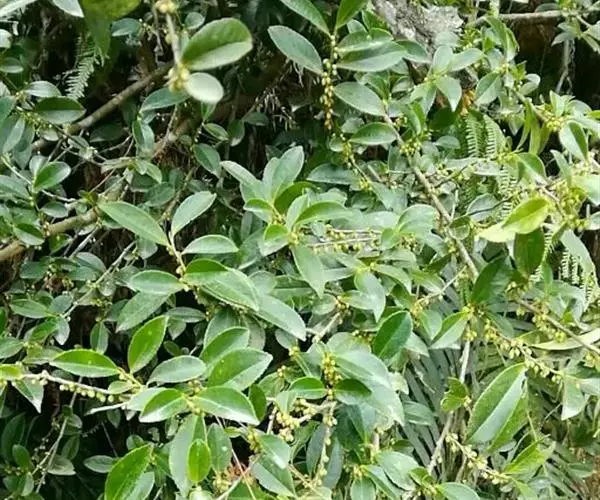 原生形态:灌木,高1-3m.嫩枝有棱,无毛或有疏毛。单叶互生;叶柄长2-5mm;叶片革质,成两列状,椭圆形至圆状披针形,长3-6cm,宽1.5-3cm,先端锐尖或渐尖,微凹,基部楔形,边缘具钝齿,上面深绿色,下面黄绿色,两面均无毛,主脉在上面下陷,侧脉不明显。花单性,雌雄异株,常1-3朵簇生于叶腋和枝侧;花梗短,下垂;萼片5,近圆形,宿存;花瓣5,白色或黄绿色,卵形,基部连合;雄花的雄蕊多数,短于花瓣,退化子房有或无;雌花无雄蕊,花柱短,先端3浅裂。浆果圆球形,径约5mm,成熟时紫黑色。花期8月底至12月底。