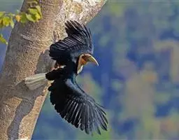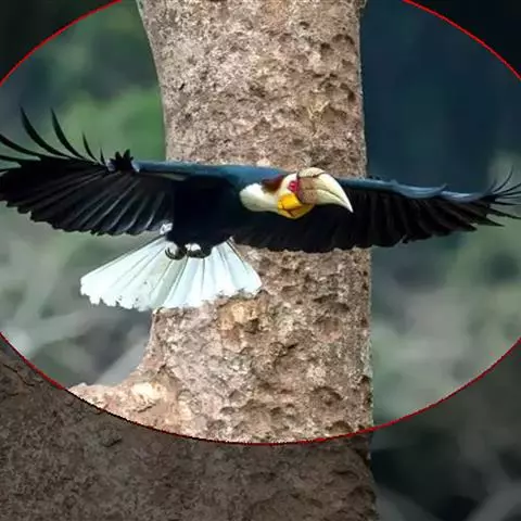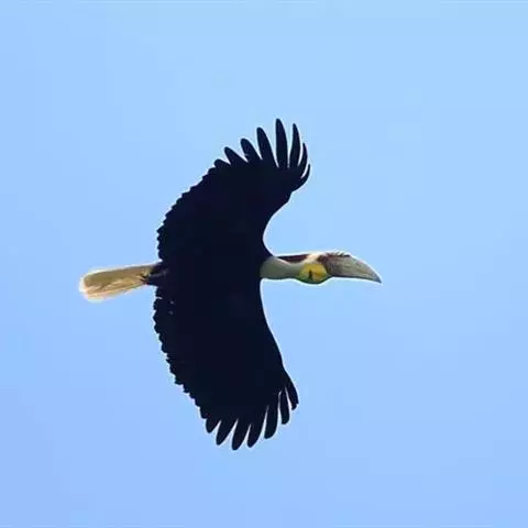 在西双版纳的密林中,身型庞大的犀鸟,飞行速度较慢,飞翔时翅膀发出极大的声响,就像天上过飞机一样,而且停落在树顶时,不时地发出响亮而粗历的鸣叫声,连续不断,能传出很远,如同马嘶一般。