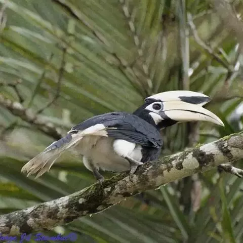犀鸟(Anthracoceros albirostris)是一种奇特而珍贵的大型鸟类,佛法僧目犀鸟科,为本科动物的统称。犀鸟以某些种类上嘴基部的骨质盔突而著名。嘴就占了身长的1/3到一半,宽扁的脚趾非常适合在树上的攀爬活动,一双大眼睛上长有粗长的眼睫毛。最古怪的是在它的头上。长有一个铜盔状的突起,叫做盔突,就好像犀牛的角一样,故而得名犀鸟。主要分布于非洲及亚洲南部,大部分犀鸟生活在非洲和亚洲的热带雨林地区,以树上那些多半是啄木鸟啄出来的空洞为巢。