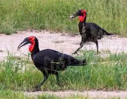 左图.冠斑犀鸟 右图双角犀鸟 因嘴呈象牙色,外形又像犀的角,故称为犀鸟。我国有4种:白喉小盔犀鸟(Ptilolaemus tickelli)、双角犀鸟(Buceros bicornis)、棕颈无盔犀鸟(Aceros nipalensis)和冠斑犀鸟(Anthracoceros coronatus)。冠斑犀鸟最为常见,体长约75~80厘米。背面羽毛纯黑,具有绿色金属光泽。翼缘、飞羽和尾羽先端白色。雄鸟嘴长大而下弯,约长15厘米,嘴上端的基部具有高大轻而坚固的盔突,雌鸟的盔突较小。嘴和盔突内为疏松的骨质纤维,故轻坚而灵巧。眼睑边缘有长形睫毛。常栖息于干燥森林中的巨木上,以果实、昆虫为食。在生殖季节,最为奇特的是雌鸟自选树洞,雄鸟衔泥等物在洞外协助封闭洞口,雌鸟在已封口的树洞内孵卵育雏;雄鸟担负在裂缝式的洞口处喂食。每窝孵卵2~4个,雌鸟直至雏鸟能出飞时方换羽外出。我国仅云南西部以及南部西双版纳和广西南部有此鸟。为留鸟。由于珍稀,所有种均被列为国家二级保护动物。