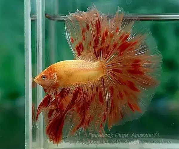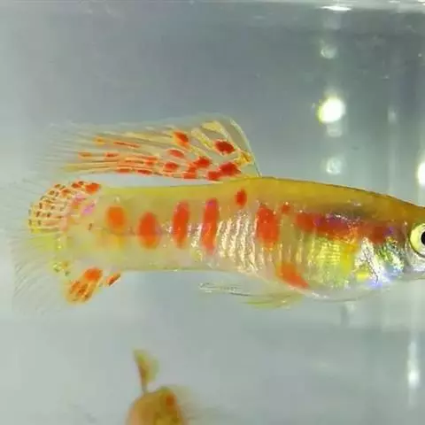 体黄褐色,具有金色光泽,但体色的变异很大,常具有鲜丽的橘黄色或蓝青色斑纹。成长后雌鱼的体色较单调而半透明,如同大肚鱼一般。较雄鱼体色逊色得多,多为单一银灰色,尾鳍上虽有一些花纹,均没有雄鱼的鲜艳。