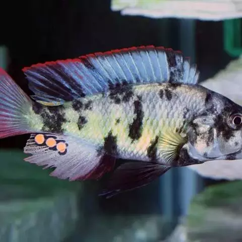 孔雀鱼体形娇小,其身上的图案五彩缤纷,有的形如字母,称外文孔雀;有的像蛇纹,称蛇皮孔雀;有的似豹皮,称豹尾孔雀,等等。背鳍较长,尾鳍宽而长,约占全长的1/2以上,尾柄长度大于尾柄高度,背鳍软条 7-8,臀鳍软条8-10。其身体及背鳍、尾鳍的颜色五彩缤纷,主要有红色、蓝色、黑色、黄色、绿色、虎皮色及杂色等。尾鳍和体腹上有蓝红色圆斑,其周围有淡色花纹,似孔雀尾翎花色,故以此得名。