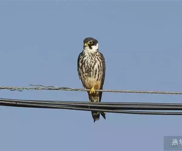 燕隼 燕隼俗称为青条子、蚂蚱鹰、青尖等,体形比猎隼、游隼等都小,为小型猛禽,体长28-35厘米,体重为120-294克。上体为暗蓝灰色,有一个细细的白色眉纹,颊部有一个垂直向下的黑色髭纹,颈部的侧面、喉部、胸部和腹部均为白色,胸部和腹还有黑色的纵纹,下腹部至尾下覆羽和覆腿羽为棕栗色。尾羽为灰色或石板褐色,除中央尾羽外,所有尾羽的内 均具有皮黄色、棕色或黑褐色的横斑和淡棕黄色的羽端。飞翔时翅膀狭长而尖,像镰刀一样,翼下为白色,密布游黑褐色的横斑。翅膀折合时,翅尖几乎到达尾羽的端部,看上去很象燕子,因而得名。虹膜黑褐色,眼周和蜡膜黄色,嘴蓝灰色,尖端黑色,脚、趾黄色,爪黑色。