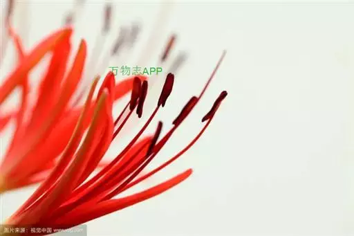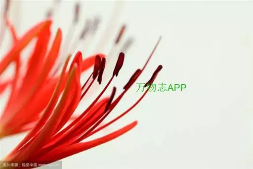 石蒜是多年生草本植物,鳞茎近球形,直径1-3厘米。秋季出叶,叶狭带状,长约15厘米,宽约0.5厘米,顶端钝,深绿色,中间有粉绿色带。花茎高约30厘米;总苞片2枚,披针形,长约35厘米,宽约05厘米;伞形花序有花4-7朵,花鲜红色;花被裂片狭倒披针形,长约3厘米,宽约05厘米,强度皱缩和反卷,花被简绿色,长约05厘米;雄蕊显著伸出于花被外,比花被长1倍左右。花期8-9月,果期10月。