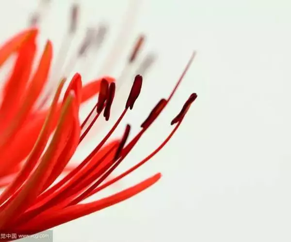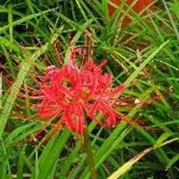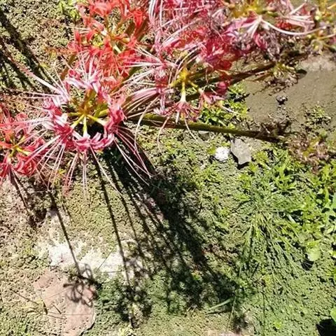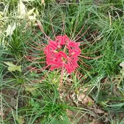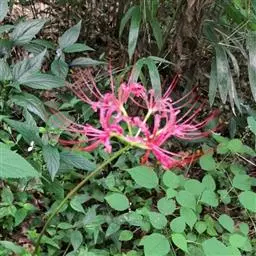石蒜(学名:Lycoris radiata (L’Her.) Herb.):鳞茎近球形。秋季出叶,叶狭带状,顶端钝,深绿色,中间有粉绿色带;花茎高约30厘米;总苞片2枚,披针形;长约35厘米,宽约05厘米;伞形花序有花4-7朵;花鲜红色;花被裂片狭倒披针形,长约3厘米,宽约05厘米,强度皱缩和反卷;花被简绿色,长约05厘米;雄蕊显著伸出于花被外,比花被长1倍左右。花期8-9月,果期10月。