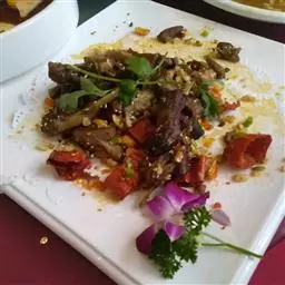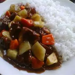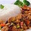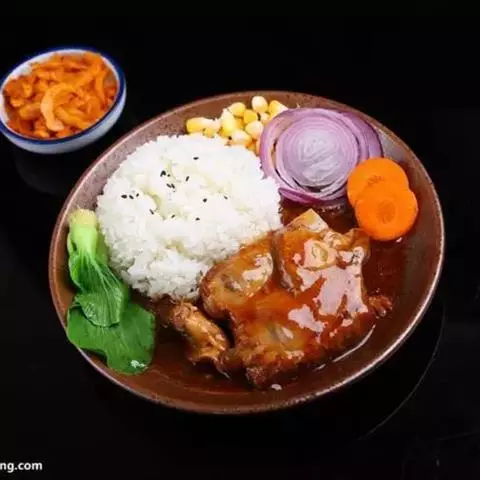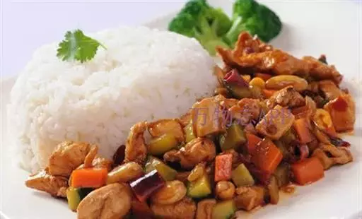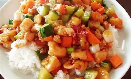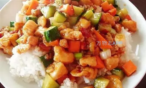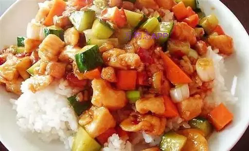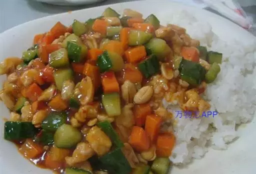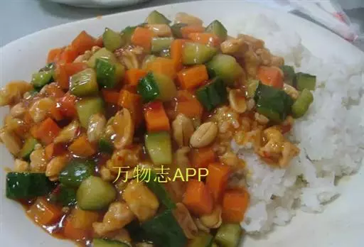 宫保鸡丁盖饭是一道简单的家常饭,主料是鸡胸肉、青笋、胡萝卜、大蒜、葱、干辣椒、盐、味精、胡椒粉、糖、醋、老抽、料酒、淀粉,热白饭一碗。