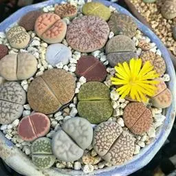 生石花,番杏科生石花属多年生肉质草本植物。植株几乎无茎;花朵较大,颜色艳丽,呈多边形,…