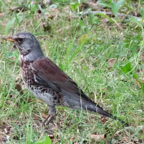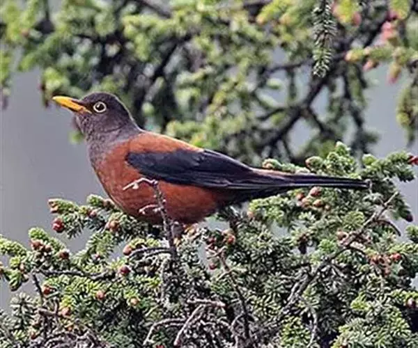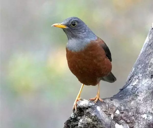 灰头鸫(学名:Turdus rubrocanus):中型鸟类,体长23-27厘米。整个头、颈和上胸褐灰色,两翅和尾黑色,上、下体羽栗棕色。颏灰白色,尾下覆羽黑色具白色羽轴纹和端斑。嘴、脚黄色。