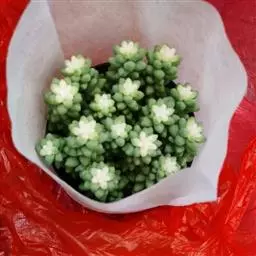 3.锅内烧开水,撒一点儿盐,放蒜薹焯一分半钟,捞出,沥干水份备用