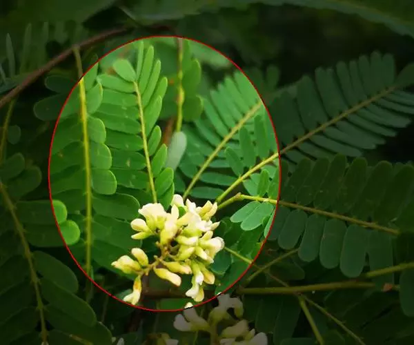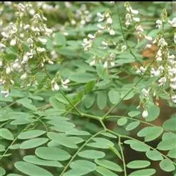 圆锥花序腋生,比复叶短,长1.5-5厘米,分枝聚伞花序状;总花梗、花序轴、分枝与花梗均被柔毛;花小,稍密集,长约5毫米;小苞片卵形,被柔毛,脱落;花萼钟状,略被毛,萼齿除下方1枚较长,为披针形之外,其余的卵形,均具缘毛;花冠白色或淡黄色,花瓣具短柄,旗瓣长圆状倒卵形,先端微凹缺,翼瓣倒卵状长圆形,龙骨瓣椭圆形;雄蕊9,偶有10枚,单体,花丝长短相间;子房具柄,沿腹缝线疏被柔毛,其余无毛,花柱短,柱头小,有胚珠2-3粒。
