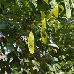 荚果无毛,长圆形至带状,扁平,长3-6厘米,宽1-2厘米,顶端急尖,基部钝或楔形,具稍长的果颈,果瓣革质,对种子部分有网纹,有种子1 (-2)粒;种子肾形,扁平,长约10毫米,宽约6毫米。花期4-5月。