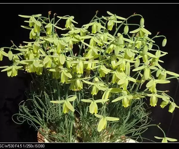 花梗极长,由叶丛中抽出,花芽黄绿色,总状花序,小花下垂,花瓣正面淡黄色,背面黄绿色,具淡雅芳香。花在阳光充足时开放,傍晚闭合,若遇阴雨天或光照不足,则不会开花,花期3-4月。