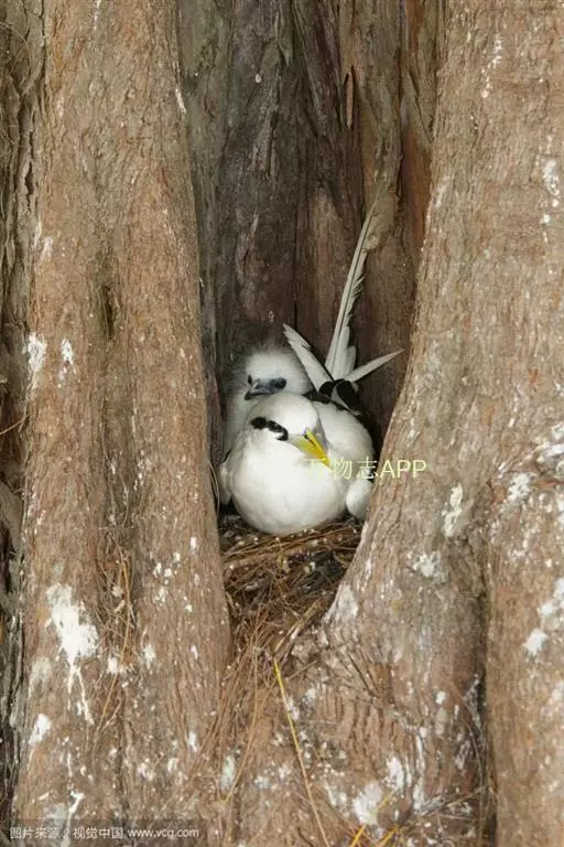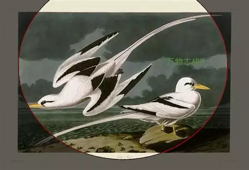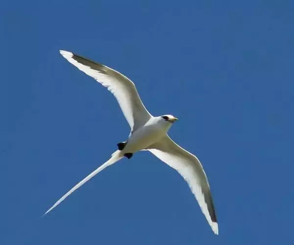白尾鹲(学名:Phaethon lepturus):体重220-410克;体长370-400毫米,加上延长的尾羽为680-990毫米,是一种中型热带海鸟。全身羽毛主要为白色,繁殖期微缀有橙色。眼前和眼后有粗著的黑色斑,像两条粗黑的眼眉。翅基部和两胁亦有黑色,飞翔时可明显看见翼上两条黑色斜线。中央两枚尾羽特别长,白色。虹膜褐色;嘴橘黄或黄色,经过鼻孔有一条黑线,跗蹠黄色,趾和蹼黑色。
