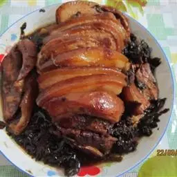10. 炒勺烧热,放香油,待热时将打散的鸡蛋汁倒入锅中,摊成蛋饼,两面煎黄,盖在合菜上,即全部完成。