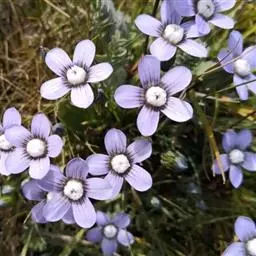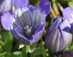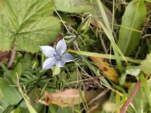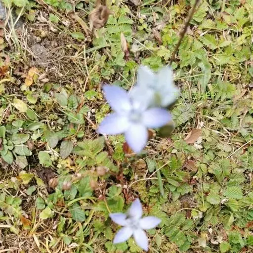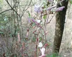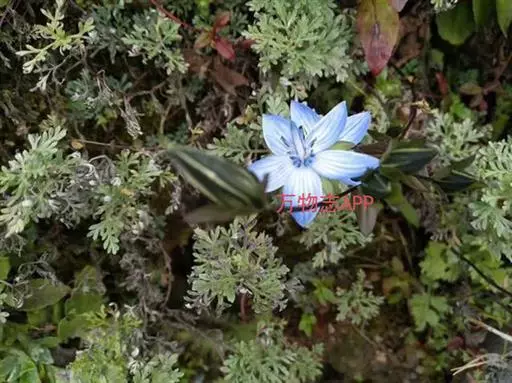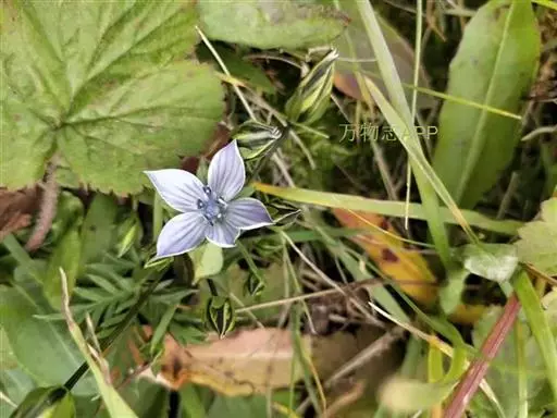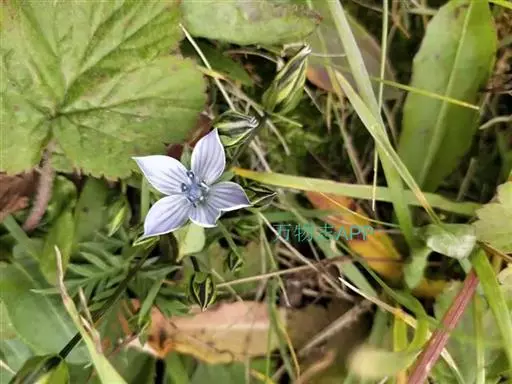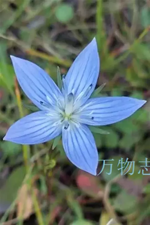 辐状肋柱花,又名辐花侧蕊。一年生草本,高15-40厘米。茎不分枝或自基部有少数分枝,近四棱形,直立,绿色或常带紫色。叶无柄,狭长披针形、披针形至线形,长至43毫米,宽1.5-4毫米,枝及上部叶较小,先端急尖,基部钝,半抱茎,中脉在两面明显。花5数,顶生和腋生,直径2-3厘米,花梗直立或斜伸,四棱形,不等长,长至8厘米;花萼较花冠稍短或等长,裂片线形或线状披针形,稍不整齐,长8-22(27)毫米,先端急尖,花冠淡蓝色,具深色脉纹,裂片椭圆状披针形或椭圆形,一般长1.5-2.5厘米,先端钝或急尖,基部两侧各具1个腺窝,腺窝管形,边缘具不整齐的裂片状流苏;花丝线形,长6-8毫米,花药蓝色,狭矩圆形,长3-4.5毫米;子房无柄,长12-14毫米,柱头小,三角形,下延至子房下部。蒴果狭椭圆形或倒披针状椭圆形,与花冠等长或稍长;种子淡褐色,圆球形,直径0.3-0.4毫米,光滑。染色体2n=10。花果期8-9月。