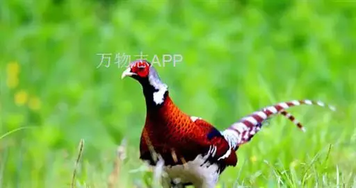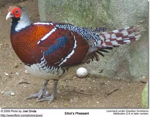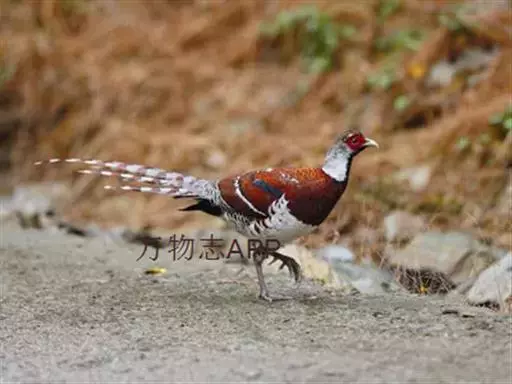 白颈长尾雉(学名:Syrmaticus ellioti):大型鸡类,体长81厘米,体型大小和雉鸡相似。雄鸟头灰褐色,颈白色,脸鲜红色,其上后缘有一显著白纹,上背、胸和两翅栗色,上背和翅上均具1条宽阔的白色带,极为醒目;下背和腰黑色而具白斑;腹白色,尾灰色而具宽阔栗斑。雌鸟体羽大都棕褐色,上体满杂以黑色斑,背具白色矢状斑;喉和前颈黑色,腹棕白色,外侧尾羽大都栗色。
