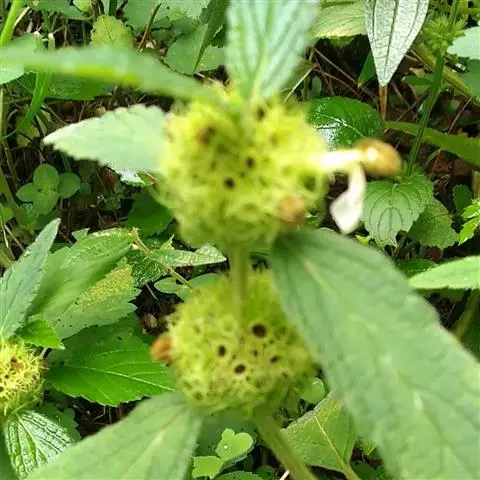 草本,从纤细须根伸出,高30-80cm,有时至1m。茎直立,或上部多扭曲,纤弱,通常在上部分枝,偶有自基部分枝,钝四棱形,微具沟槽,密被贴生或倒向的金黄色长硬毛,有时在茎基部毛被略脱落。叶卵状披针形或披针形,长6-9cm,宽1-3cm,先端锐尖,基部宽楔形至近圆形,有远离的浅锯齿,纸质,上面绿色,下面淡绿色,上面贴生浅黄色短柔毛,下面沿脉上密被短柔毛,余部疏被微柔毛,明显密布淡黄色腺点,侧脉3-5对,在上面微凹陷,下面稍突出;叶柄长0.6-1cm,密生金黄色长硬毛。轮伞花序腋生,少数而远离地着生于枝条的先端,球形,径1.5-2.5cm,多花密集,其下承以多数密集苞片;苞片线形,与尊筒等长或比萼筒长,边缘较薄,上面及边缘上具淡黄色长硬毛,下面无毛。花萼管状,长约1cm,先端膨大而略折曲,外面有刚毛,下部毛被稀疏或近于无毛,上部密集,内面在口部密生柔毛,脉10,明显,齿10,刺状,从截平而略偏斜的萼口突然伸长,在果时呈星状开张,长约3mm,外被长硬毛。花冠白色或紫色,长约2.8cm,冠筒长约1cm,与萼筒等长或略伸出于萼筒,外面近喉部具微柔毛,余部均无毛,内面在中部以下具略偏斜的须毛状毛环,冠檐二唇形,上唇直仲,盔状,长圆形,外面密被金黄色长柔毛,内面无毛,下唇较上唇长1.5倍,平展,3裂,中裂片倒梯形,先端2圆裂,侧裂片卵圆形。雄蕊4,内藏,前对较长,花丝丝状,花药卵圆形,2室,室极叉开。花柱丝状,略与雄蕊等长,先端极不等2裂。花盘平顶,波状。子房无毛。小坚果卵珠形,褐色。花期7-10月,果期10-11月。