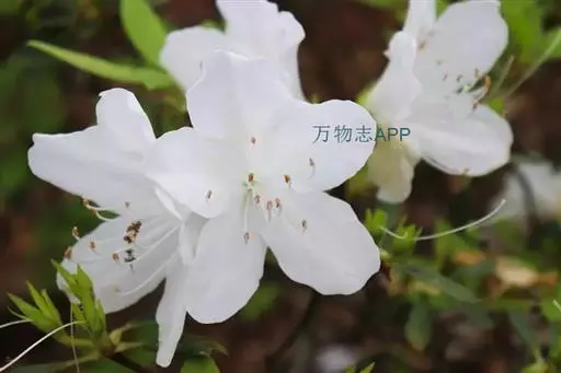 白花杜鹃(学名:Rhododendron mucronatum (Blume) G. Don ):半常绿灌木,高1-2米;幼枝开展,分枝多。叶纸质,披针形至卵状披针形或长圆状披针形,上面深绿色,混生短腺毛。伞形花序顶生,具花1-3朵;花冠白色,有时淡红色,阔漏斗形。蒴果圆锥状卵球形,长约1厘米。花期4-5月,果期6-7月。