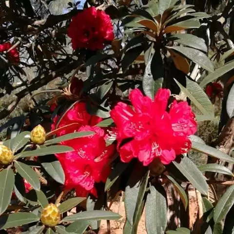 黄杯杜鹃:灌木,高约3米;幼枝嫩绿色,平滑无毛,老枝灰白色,树皮有时层状剥落。叶多密生于枝端,革质…