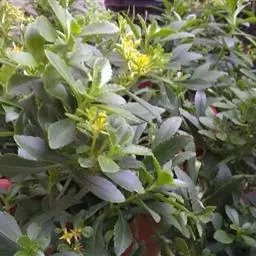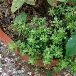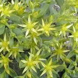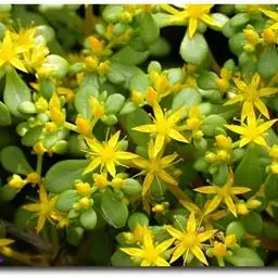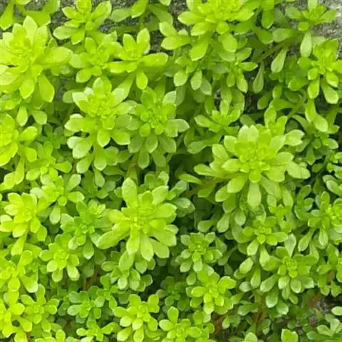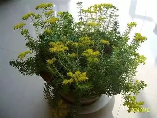 佛甲草是多年生肉质草本,全体无毛。茎纤细倾卧,长10~15厘米,着地部分节节生根。叶3~4片轮生,近无柄,线形至倒披针形,长2~2.5厘米,先端近短尖,基部有短矩。聚伞花序顶生,花黄色,细小;萼5片,无距或有时具假距,线状披针形,长1.5~7毫米,钝头,通常不相等:花瓣5,矩圆形,长4~6毫米,先端短尖,基部渐狭;雄蕊10,心皮5个,成熟时分离,长4~5毫米,花柱短。蓇葖果。花期春末夏初。含水量极高,其叶、茎表皮的角质层具有超常的防止水分蒸发的特性。佛家草生长适应性强,耐寒、耐旱、耐盐碱、耐瘠,抗病虫害,茎肉多汁,碧绿的小叶宛如翡翠,整齐美观,既可作为盆栽欣赏,也可作为露天观赏地被栽植。 佛甲草