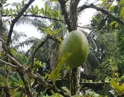 圆锥花序生于小枝顶端,花序轴下垂,长50-100厘米;花稀疏,6-10朵。花萼钟状,革质,长4.5-5厘米,直径约2厘米,3-5裂齿不等大,顶端渐尖。花冠桔黄色或褐红色,裂片卵圆形,上唇2片较小,下唇3片较大,开展,花冠筒外面具凸起纵肋。雄蕊4,2强,外露,花药个字形着生,药室2,纵裂。花盘环状。柱头2裂,子房1室,胚珠多数。果下垂,圆柱形,长38厘米左右,直径12-15厘米,坚硬,肥硕,不开裂,果柄长8厘米。种子多数,无翅,镶于木质的果肉内。