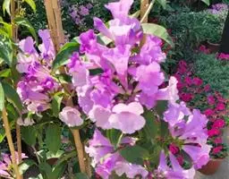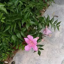 粉花凌霄 K.Schum.)是紫葳科魔盒凌霄属的落叶藤本植物。奇数羽状复叶对生,小叶全缘,…