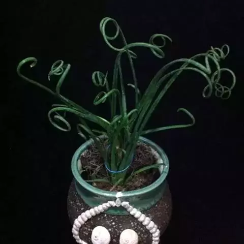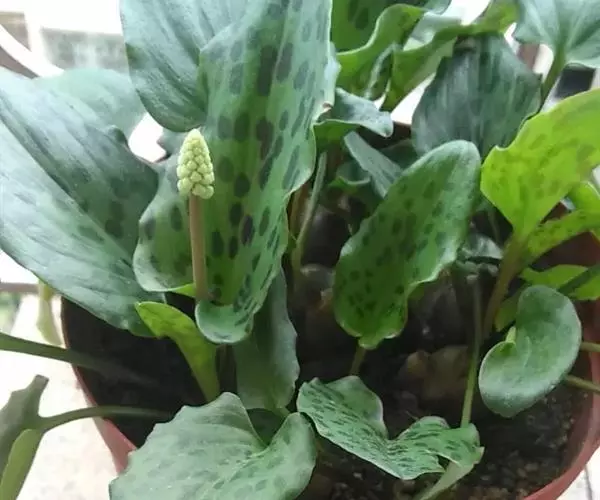 叶片浅绿,全部丛生,上面散布深色的斑点,是有趣的观叶植物。叶以上伸出高高的花葶,顶端挨挨挤挤是白色转绿色的小花;叶以下是翡翠色的膨大鳞茎。整个植物矮小紧凑,是招人喜欢的盆栽植物。