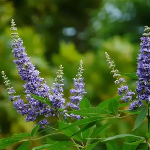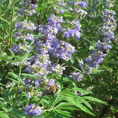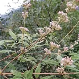 小叶荆(Vitexn egundoL.var.microphyllaHand.-Mazz..),灌木。掌状复叶,小叶3-7,通常5;小叶片椭圆状披针形,全缘,顶端渐尖,基部楔形,表面绿色,背面密生灰白色绒毛,中间小叶片长1.5-4厘米,宽0.5-1厘米。花序顶生,长5-11厘米。果实有毛。花果期7-11月。