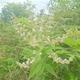 拟黄荆(Vitex negundoL.var.thyrsoidesPei),掌状复叶,小叶3-5;小叶片披针形或狭椭圆形,全缘,表面疏生柔毛或在脉上有毛,背面密生灰白色绒毛。圆锥花序由假聚伞花序组成,最末侧枝上的花常呈总状排列。花果期8-10月。