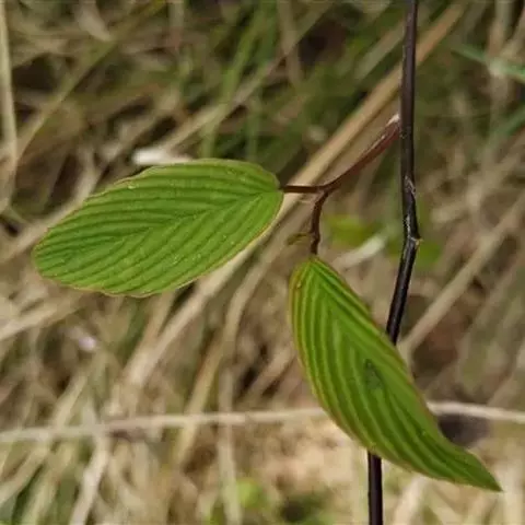 藤状或直立灌木;幼枝黄绿色,光滑无毛。叶纸质,上部叶较小,卵形或卵状椭圆形至与卵状披针形,长4-9厘米,宽2-5厘米,顶端锐尖,下部叶较大,椭圆形至矩圆形,长达11匣米,宽达6.5厘米,顶端钝或圆形,稀短渐尖,基部圆形,稀心形,上面绿色,无毛,下面干时栗色,无毛,或仅沿脉基部被疏短柔毛,侧脉每边9-12条,两面稍凸起;叶柄长1-2厘米,稀5.2厘米,无毛;托叶狭披针形,宿存。