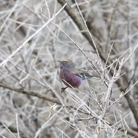 凤头雀莺:小型鸟类。体长9-10厘米,雄鸟呈毛茸茸的紫色和绛紫色,顶冠淡紫灰色,额及凤头白色,尾全蓝。…