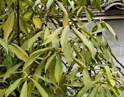 灌木,通常3-5米。枝条褐色,有浅棕色纵裂的皮孔,无毛。叶常生于枝条的梢端,线状披针形,长4-12(16)厘米,宽约1-2.5(3.2)厘米,先端渐尖,基部渐狭成楔形,革质,上面无毛,但不甚光亮,下面暗粉绿色,无毛,或嫩叶有时有贴伏微柔毛,中脉上面平坦,下面明显,侧脉纤细,每边约6-8(11)条,两面不明显或明显,小脉密网状,两面形成蜂巢状浅窝穴;叶柄长7-15毫米。聚伞状圆锥花序多数,生于新枝上端,少分枝,通常长约3厘米,无毛,或总梗和各级序轴、花梗被或疏或密的绢状微毛;花黄色或淡黄色,花梗长2-5毫米;花被筒倒圆锥形;花被裂片长圆形,外轮的略短小,两面被绢状小柔毛,内面的毛较密,雄蕊花丝被柔毛,基部的毛较密,雄蕊第三轮稍长,腺体圆状肾形,连柄长达花丝的1/2,退化雄蕊先端三角状箭头形,柄密被柔毛;子房近球形,花柱纤细,柱头偏头状。果序疏松,少果,生小枝先端,长3.5-7.5厘米,或在热带温暖气侯下,新枝继续生长,开花期常抽出新叶,显出果序生于新枝的下端,有时果序与叶等长,长有达14厘米的;果球形,直径约7-10毫米,嫩时绿色,熟时紫黑色;果梗红色。花期2-3月,果期4-6月。