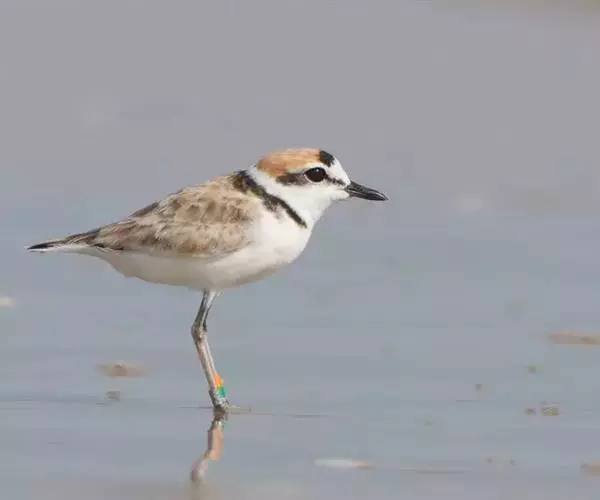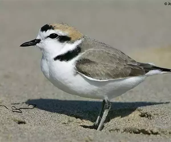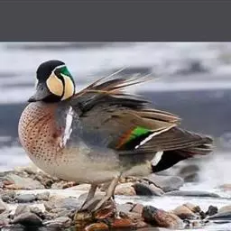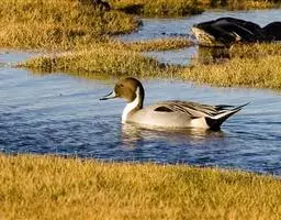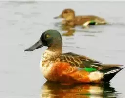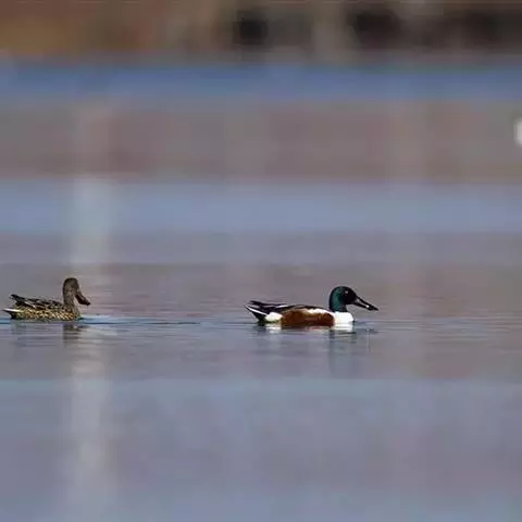 环颈鸭(图3) 双翼,下体侧面浅灰色,胸部鲑鱼色有黑色斑点。有一道黑色宽带纹由头顶延至颈背。雌鸭有橄榄褐色斑点双翼,头部和脸颊有白色条纹,胸部和腹部苍白有斑纹。雌雄都有黑色的尾巴,臀部白色,飞翼上有独特的白色斑,鸭喙灰色,腿和脚粉红色,虹膜棕色。