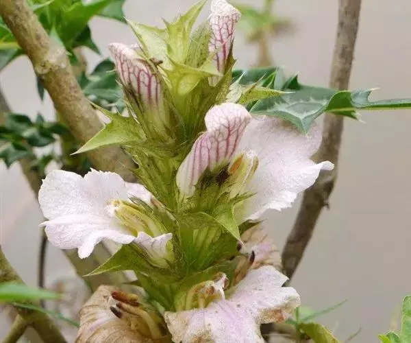 直立灌木,高达2米。托叶成刺状;叶片长圆形至长圆状披针形,先端急尖,基部楔形,边缘4-5羽状浅裂,近革质,两面无毛,主脉在上面凹下,主侧脉在背面明显凸起,侧脉每侧4-5,自裂片顶端突出为尖锐硬刺。 穗状花序顶生;苞片对生,宽卵形,长7-8毫米,无刺,早落;小苞片卵形,长约5毫米,革质;花萼裂片4,外方的1对宽卵形,长10-13毫米,顶端微缺,边缘质薄,有时成皱波状,具缘毛,内方的1对卵形,长约10毫米,全缘。花冠白色,长3-4厘米,花冠管长约6毫米,上唇退化,下唇倒卵形,长约3厘米,薄革质,顶端3裂,外面被柔毛,内面上部两侧各有1条3-4毫米宽的被毛带;雄蕊4,近等长,花药1室,纵裂,裂缝两侧各有1列髯毛,花丝粗厚,长1.5厘米,最宽处约2毫米,近软骨质;子房顶部软骨质,花柱有纵纹,长2.2厘米;柱头2裂。 蒴果椭圆形,长2.5-3厘米,有种子4颗。种子扁平,圆肾形,淡黄色。
