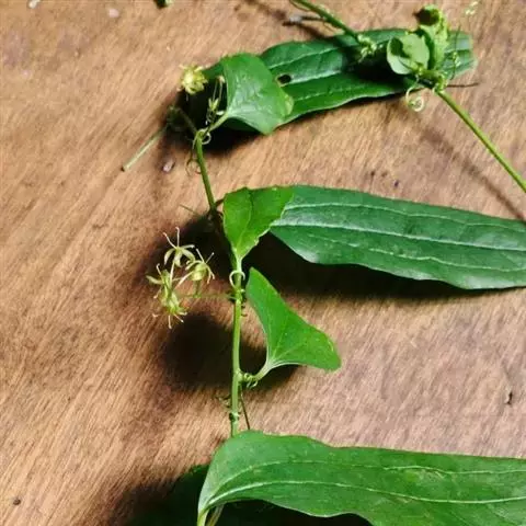 攀缘灌木,根茎块根状,有明显缩节,着生多数须根。茎光滑。单叶互生;革质,披针形至椭圆状极针形,长6~500px,宽1.2~125px,先端渐尖,基部圆形,全缘,下面常被白粉,基出脉3~5条;叶柄长1~50px,略呈翅状,近基部具开展的叶鞘,叶鞘先端常变成2条卷须。花单性,雌雄异株;伞形花序腋生,花序梗极短;小花梗纤细,基部有多数宿存的三角形小苞片;花小,白色,直径约4mm;花被裂片6,2轮;雄花的雄蕊6,花丝较花药短,退化雌蕊缺;雌花的退化雄蕊线形,子房上位,3室,柱头3歧,稍反曲。浆果球形,直径6~8mm,熟时紫黑色。花期7~8月,果期9~10月。 生长于山坡、荒山及林边的半阴地。