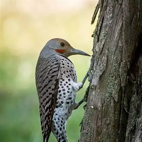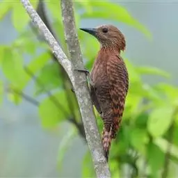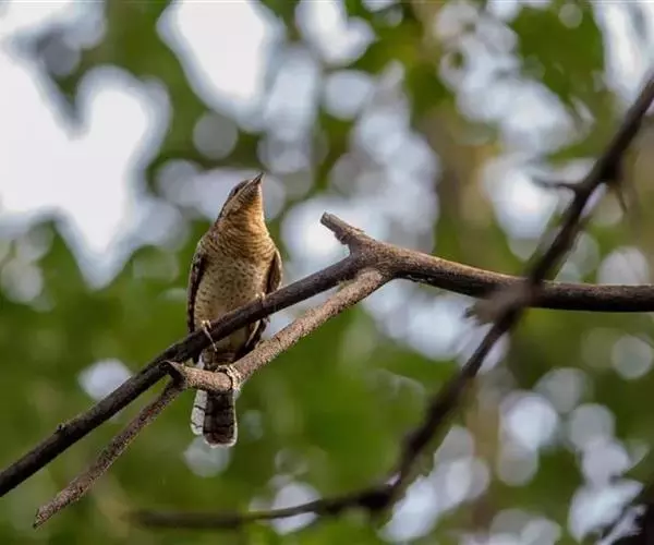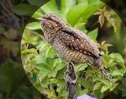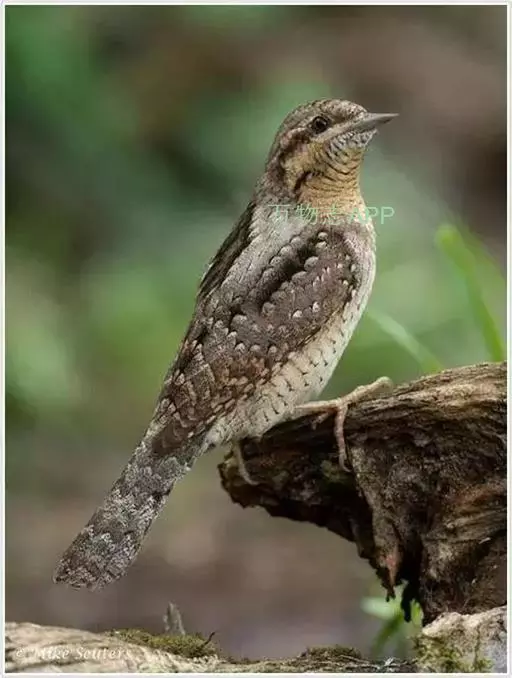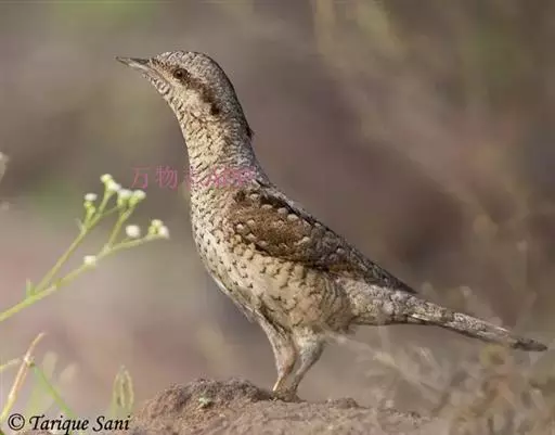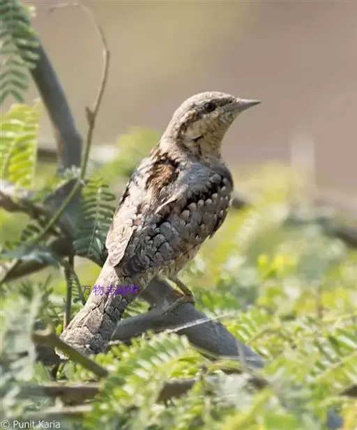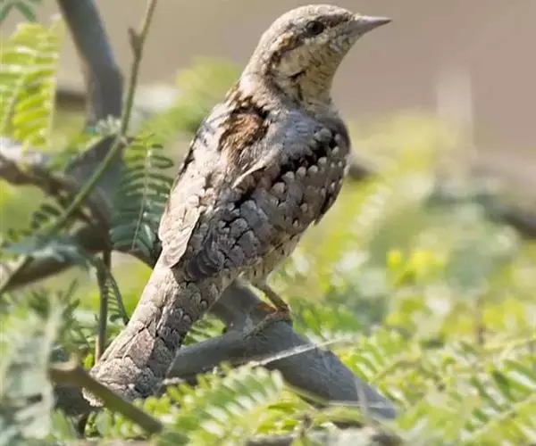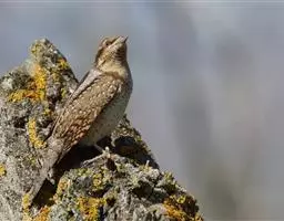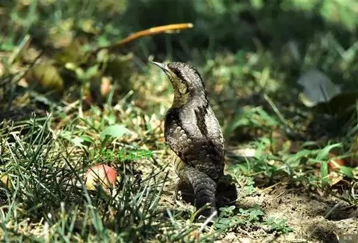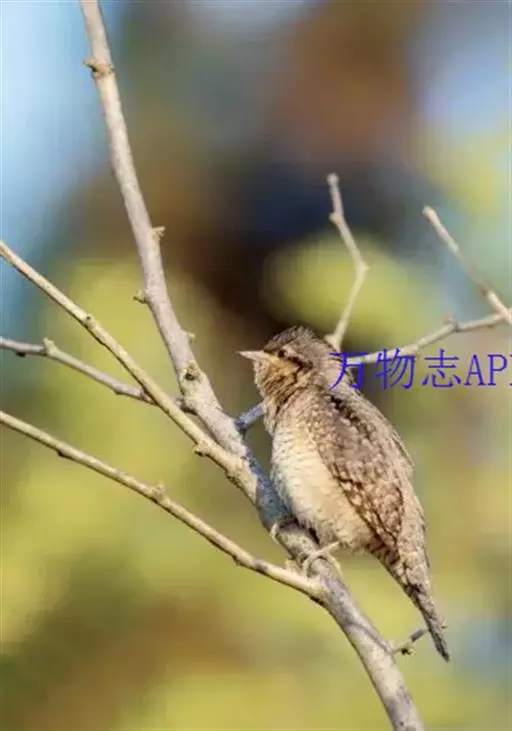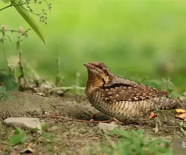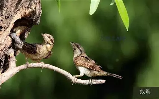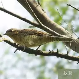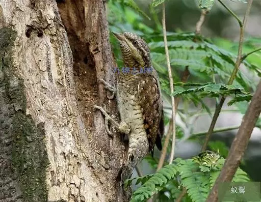 蚁䴕(学名:Jynx torquilla):又名欧亚蚁䴕,䴕形目啄木鸟科蚁䴕属小型鸟类,有6亚种。全长约17厘米。全身体羽黑褐色,斑驳杂乱,上体及尾棕褐色,自后枕至下背有一暗黑色菱形斑块;下体具有细小横斑,就啄木鸟而言,尾较长,有数条黑褐色横斑。栖息于低山丘陵和山脚平原的阔叶林或混交林的树木上。喜欢单独活动。受惊时颈部像蛇一样扭转,俗称“歪脖”。取食蚂蚁,舌长,具钩端及黏液,可伸入树洞或蚁巢中取食。在旧的啄木鸟洞穴中营巢,每窝产卵5-14枚,约12-14天出雏。
