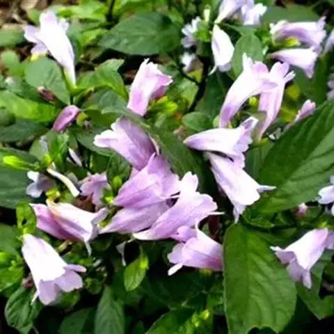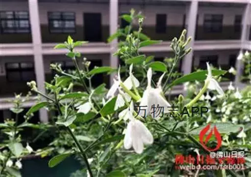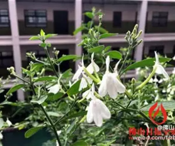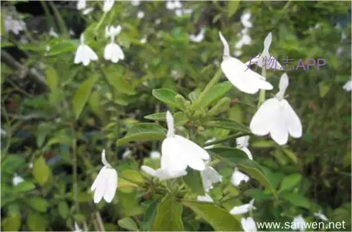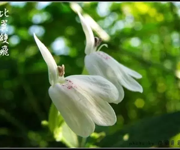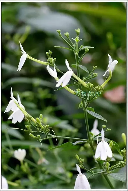 聚繖花序,著生于枝梢或叶腋,苞片细小,花萼裂片为五,条状披针形,两面生腺毛,唇形花冠白色,上唇披针状,下唇短三裂,花冠形状,在一片绿意背景中犹如一只只展翅飞翔的白鹤;可育雄蕊2枚,花药两室。