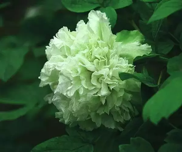 在牡丹品种中,豆绿是唯一纯正的绿色珍品,花为绣球型,因色如青豆而得名。此花是晚开品种,初开时呈青绿色,盛开时颜色渐淡,阳光下花色变白,清爽雅致,风韵独特,有一种另类脱俗的美。