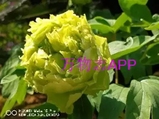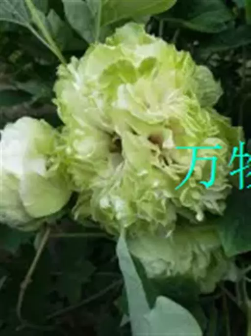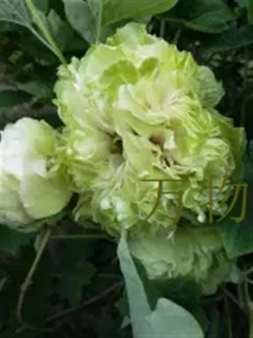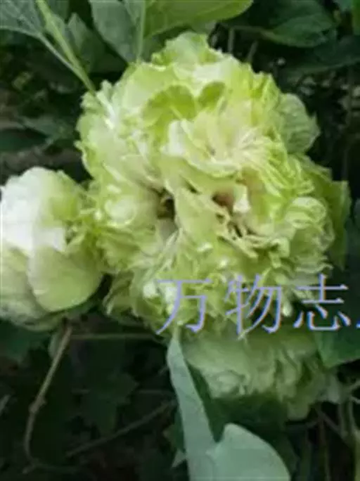 豆绿(学名:Paeonia suffruticosa 'Pea Green'):牡丹四大名品之一。落叶灌木。茎高达2米;分枝短而粗。叶通常为二回三出复叶,顶生小叶宽卵形,表面绿色,无毛,背面淡绿色,有时具白粉,沿叶脉疏生短柔毛或近无毛。花单生枝顶,苞片5,长椭圆形,大小不等;萼片5,绿色,宽卵形,大小不等;花为重瓣,皇冠型或绣球型。花蕾圆形,顶端常开裂;花黄绿色,顶端呈不规则的波状;花丝上部白色,花药长圆形,花盘革质,杯状,紫红色;心皮5,密生柔毛。蓇葖长圆形,密生黄褐色硬毛。花期5月;果期6月。