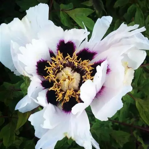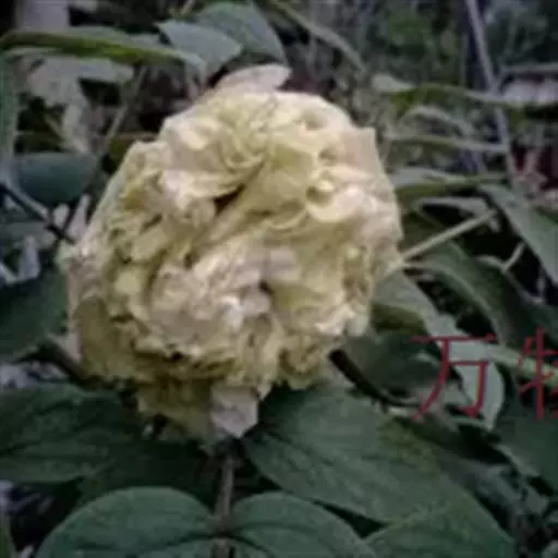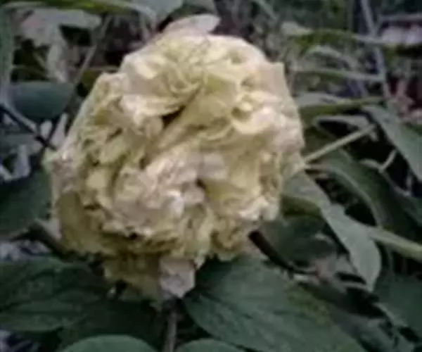 花朵皇冠型或绣球型。花蕾圆形,顶端常开裂,花黄绿色(144-D);花径12×6厘米。外瓣2-3轮,质厚而硬,基部具紫色斑,内瓣密集,皱褶;雌蕊瓣化或退化。花梗细软,花朵下垂。晚花品种。株型较矮,开展。枝较细,一年生枝短,节间较短;鳞芽狭尖形,形似鹰嘴,浅褐绿色,鳞片顶尖红色。生长势中,成花率高,萌蘖枝多。