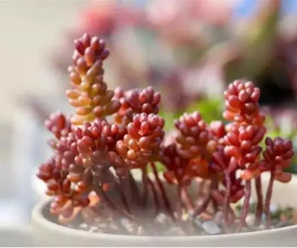 八千代是景天科,景天属多年生肉质植物。植株呈小灌木状,高可达30厘米,多分枝。…