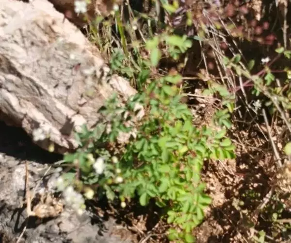 常绿草本,分枝甚多,枝、叶灰绿色,稀紫红色,嫩枝的髓部大而空心,小枝多。叶薄纸质,小裂片倒卵形、菱形或椭圆形,长1-2.5厘米,宽0.5-2厘米,背面灰绿色,老叶常变褐红色。花序有花甚多,花枝纤细,基部有小叶;萼片长约1毫米;花瓣白色,有时顶部桃红色,长圆形或倒卵状长圆形,长6-9毫米,有透明油点;8枚雄蕊长短相间,花丝白色,花药红褐色;子房绿色,基部有细柄。分果瓣长约5毫米,子房柄在结果时长4-8毫米,每分果瓣有种子4粒,稀3或5粒;种子肾形,长约1毫米,褐黑色,表面有细瘤状凸休。花果期7-11月。