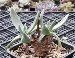 圣诞冬云属中大型多肉植物,单头植株可达10-15CM左右,叶片梭形,中端较为宽厚,前段斜尖,叶片排列紧密呈莲花状排布。圣诞冬云株型状态受季节较大影响,秋冬季,叶色较为黄绿,叶缘叶背泛红,非常迷人,夏季叶片则显得较绿,仅叶尖泛红。圣诞冬云春夏季开花,穗状花序,花倒钟型,花瓣4-5出,黄色,颇为动人。