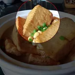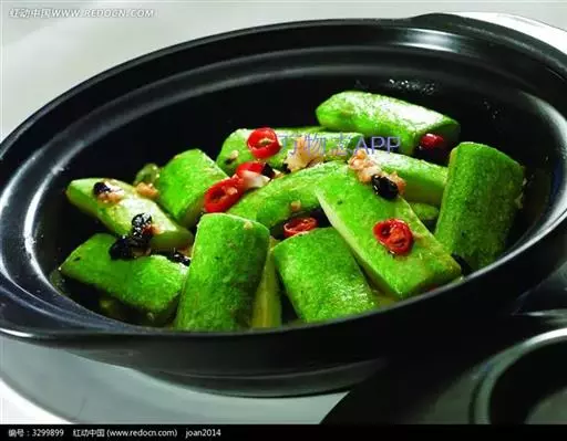 ③趁锅内余油,下蒜茸、芹菜粒、椒粒、堡仔酱爆香,接着下鸡粒炒匀,加入绍酒、上汤及茄瓜条和以上味料和炸香咸鱼茸,略焖片刻,调入少许生粉,加入包尾油。转盛入瓦煲里,加热至滚,下香油、葱花, 加盖上桌即可。