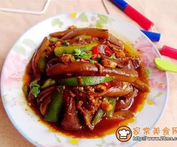 3.茄子是很吸油的,所以炒的时候锅内只需放很少的油,甚至不放油。然后将茄子里渗出来的油到进锅内,待锅烧到5成热的时候,倒入四川辣豆酱翻炒,待到油变红、豆瓣酱水份快收干的时候,放入切好的蒜姜沫。香味出来后,倒入碎猪肉,炒熟后倒入甜辣椒酱,翻炒后倒入炸好的茄子、盐,炒匀后加入少许清水。大火烧至水份快干时,加入味精,然后水淀粉勾芡,最后放入葱花起锅装盘。